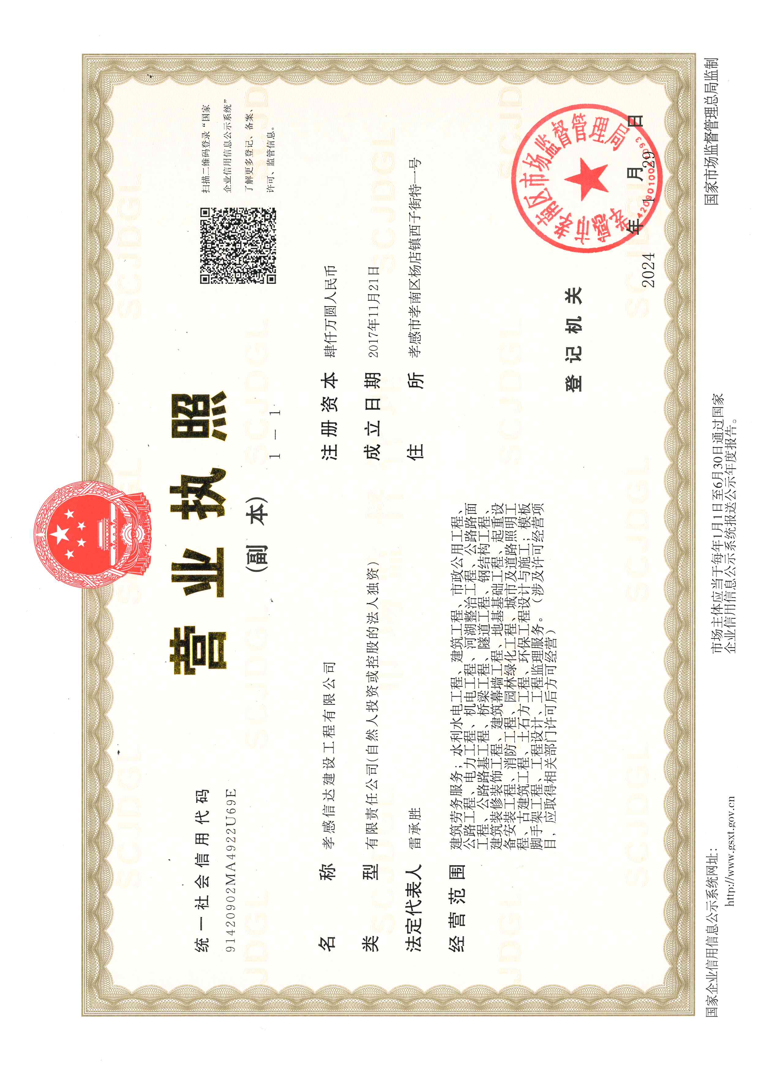 孝感信達建設工程有限公司成立于2017年11月21日,地址:孝感市孝南區楊店鎮西子街特一號,注冊資金4000萬元,有限責任公司(自然人投資或控股)。
